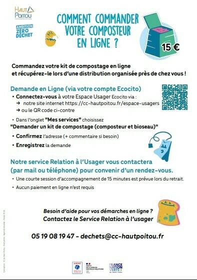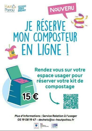 Nous vous informons que les modalités de distribution des composteurs individuels évoluent. Désormais, les composteurs seront à réserver en ligne et non plus à récupérer à notre siège situé à Neuville-de-Poitou. Vous trouverez ci-joint un mode d’emploi reprenant les étapes à suivre pour obtenir un composteur individuel. Après réservation, nos services recontacteront les usagers afin de leur proposer un créneau et un lieu de retrait proche de chez eux.