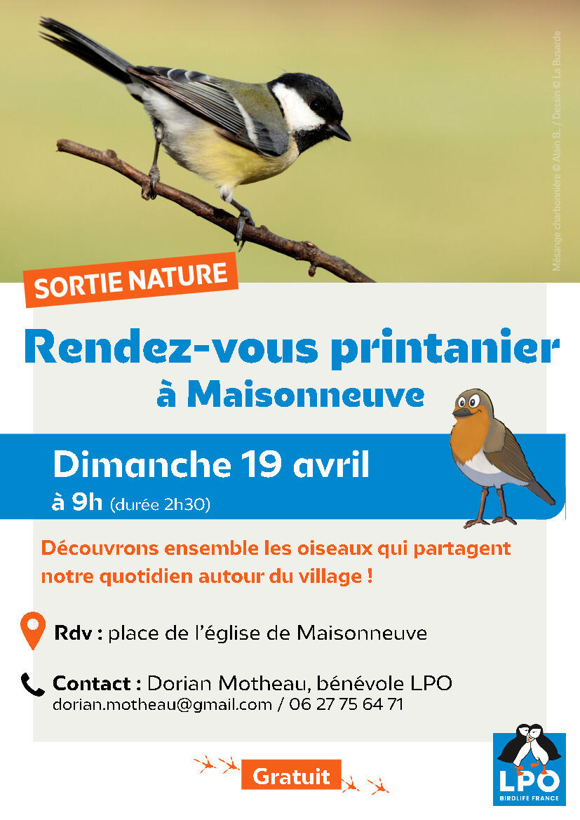 Une sortie nature aura lieu le dimanche 19 avril 2026 à 9h00 à Maisonneuve, sur le thème « Initiation à la reconnaissance des oiseaux communs par leurs chants ».