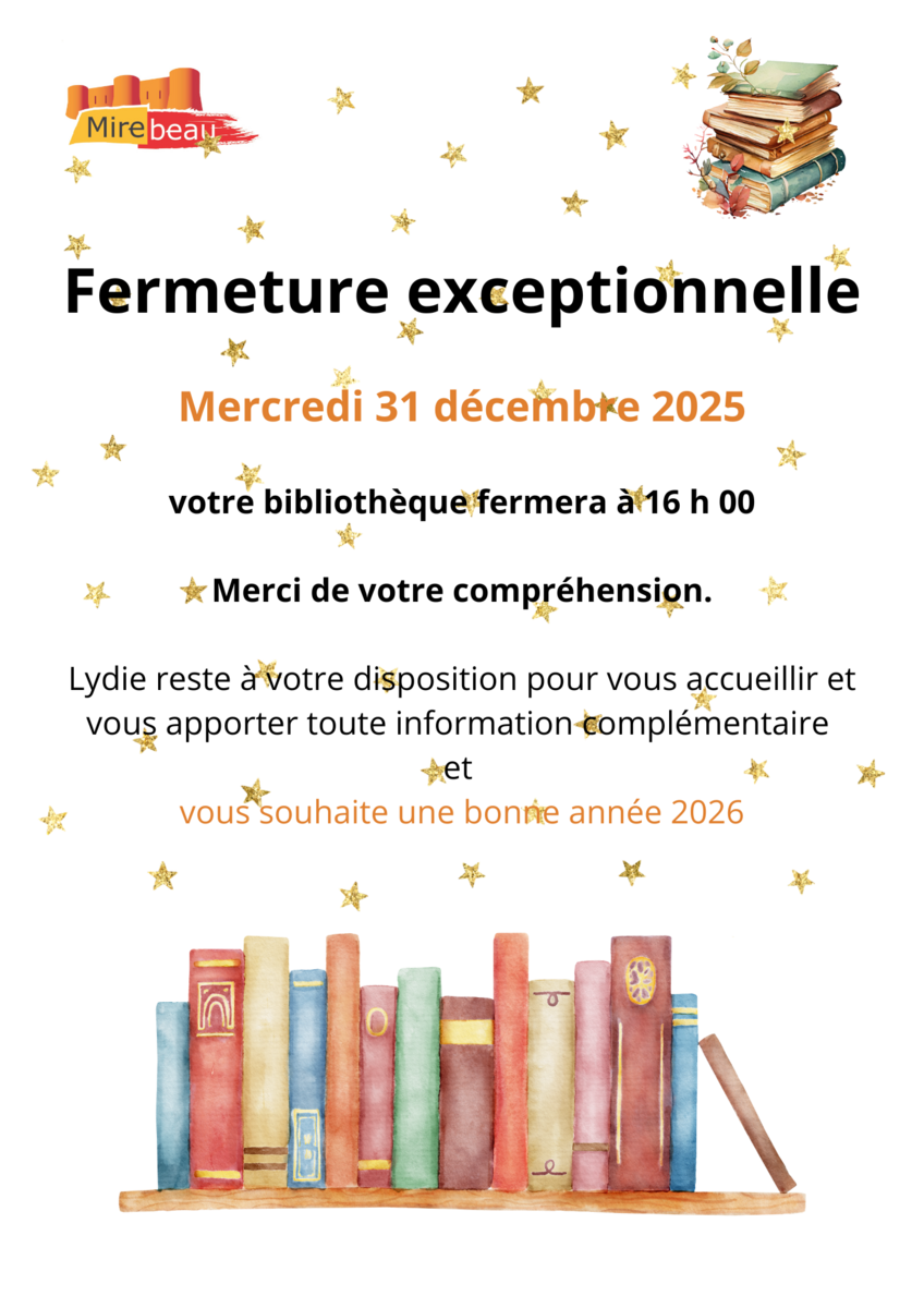 Mercredi 31 décembre 2025 - Fermeture anticipée de la bibliothèque municipale