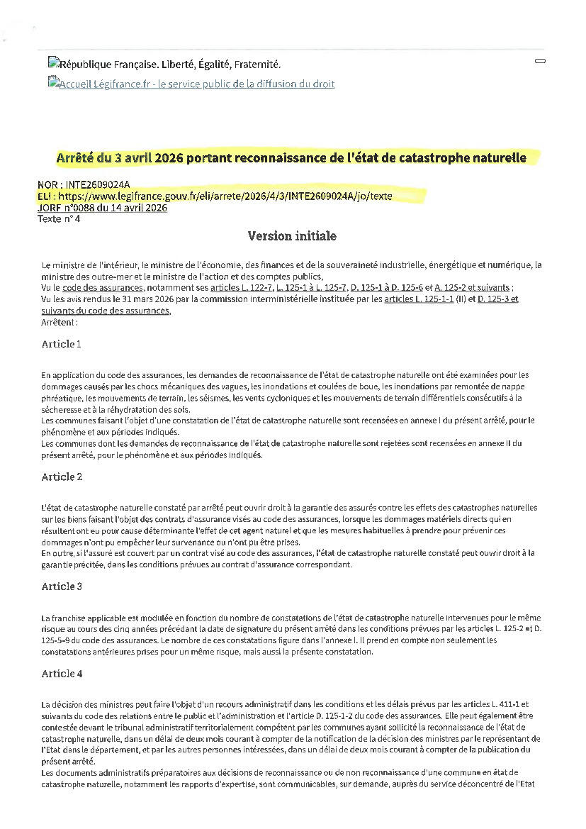 ÉTAT DE CATASTROPHE NATURELLE pour LES INONDATIONS