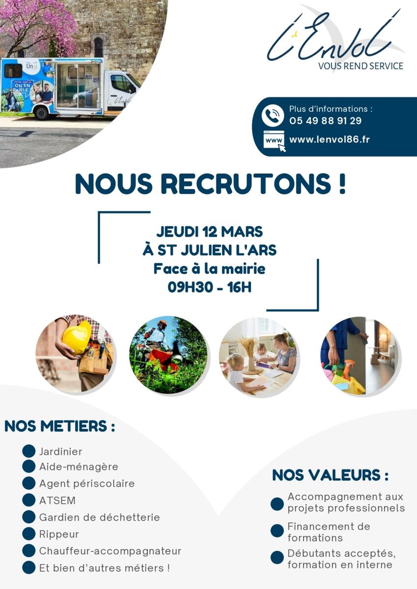 L'association intermédiaire de L'Envol réalise un job dating, en face de la mairie, le jeudi 12 mars de 09h30 à 16h00.