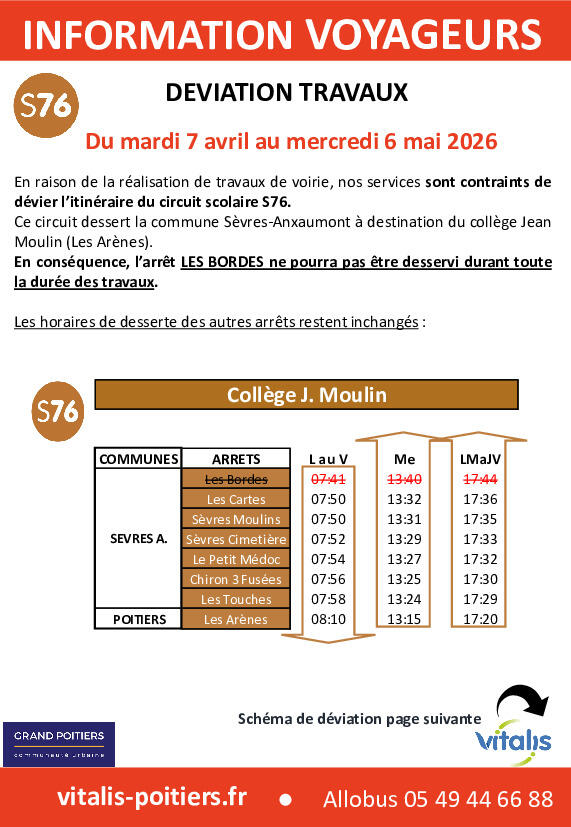 En raison de travaux effectués sur la voirie, les services Vitalis sont contraints de dévier des itinéraires entre le mardi 7 avril et le mercredi 6 mai.