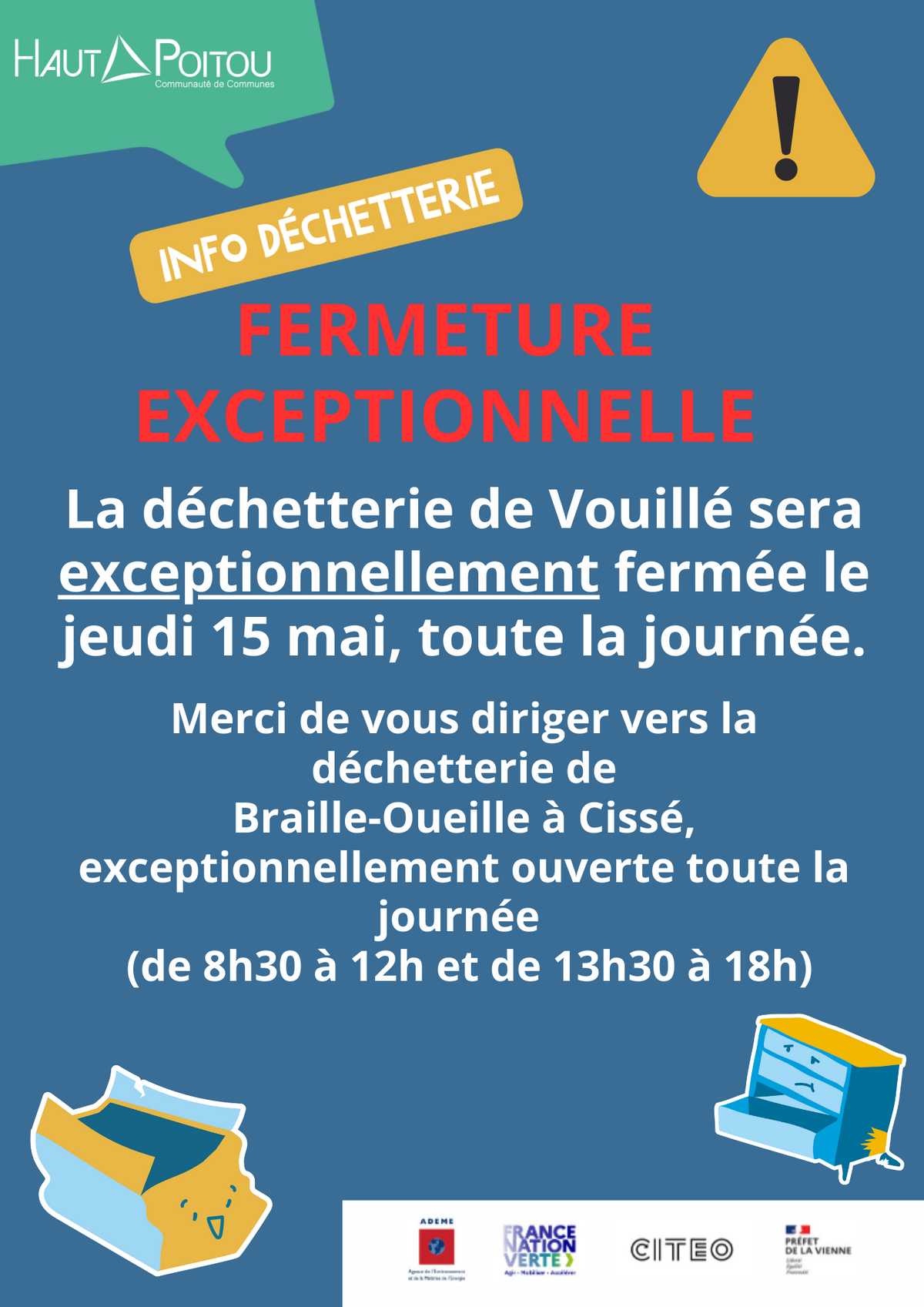 La Communauté de Communes du Haut-Poitou vous informe que la déchetterie de Vouillé sera fermée le jeudi 15 mai 2025 (toute la journée).La déchetterie de Braille-Oueille à Cissé sera exceptionnellement ouverte ce jour là, de 8h30 à 12h et de 13h30 à 18h00.