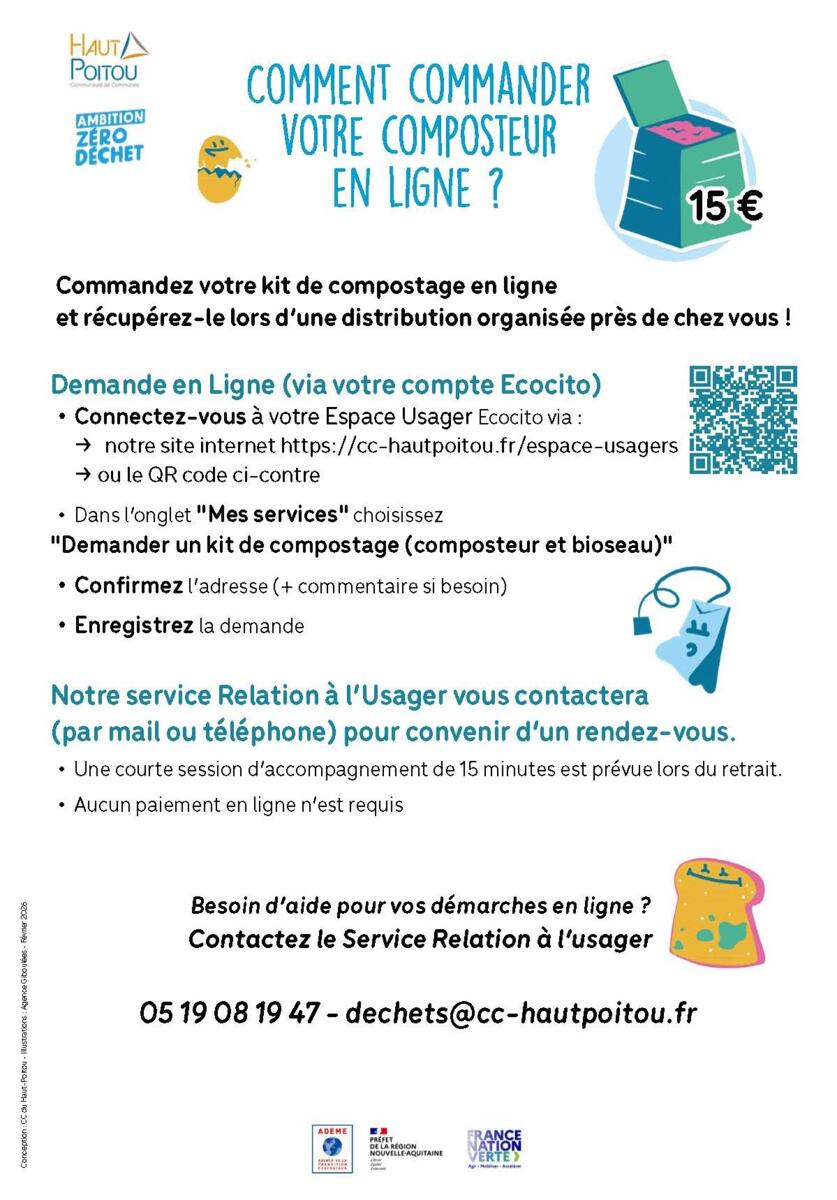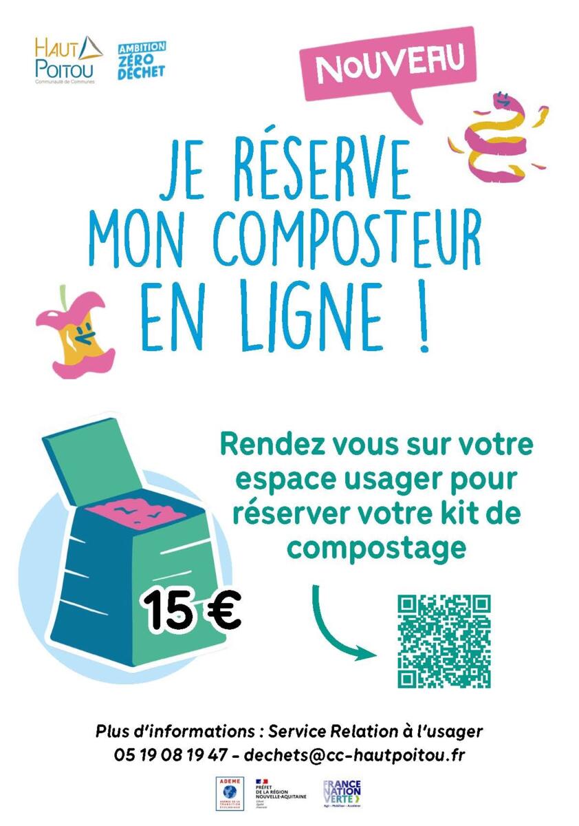 Les modalités de distribution des composteurs individuels évoluent. Désormais, les composteurs seront à réserver en ligne et non plus à récupérer à notre siège situé à Neuville-de-Poitou. Vous trouverez ci-joint un mode d’emploi reprenant les étapes à suivre pour obtenir un composteur individuel. Après réservation, nos services recontacteront les usagers afin de leur proposer un créneau et un lieu de retrait proche de chez eux.