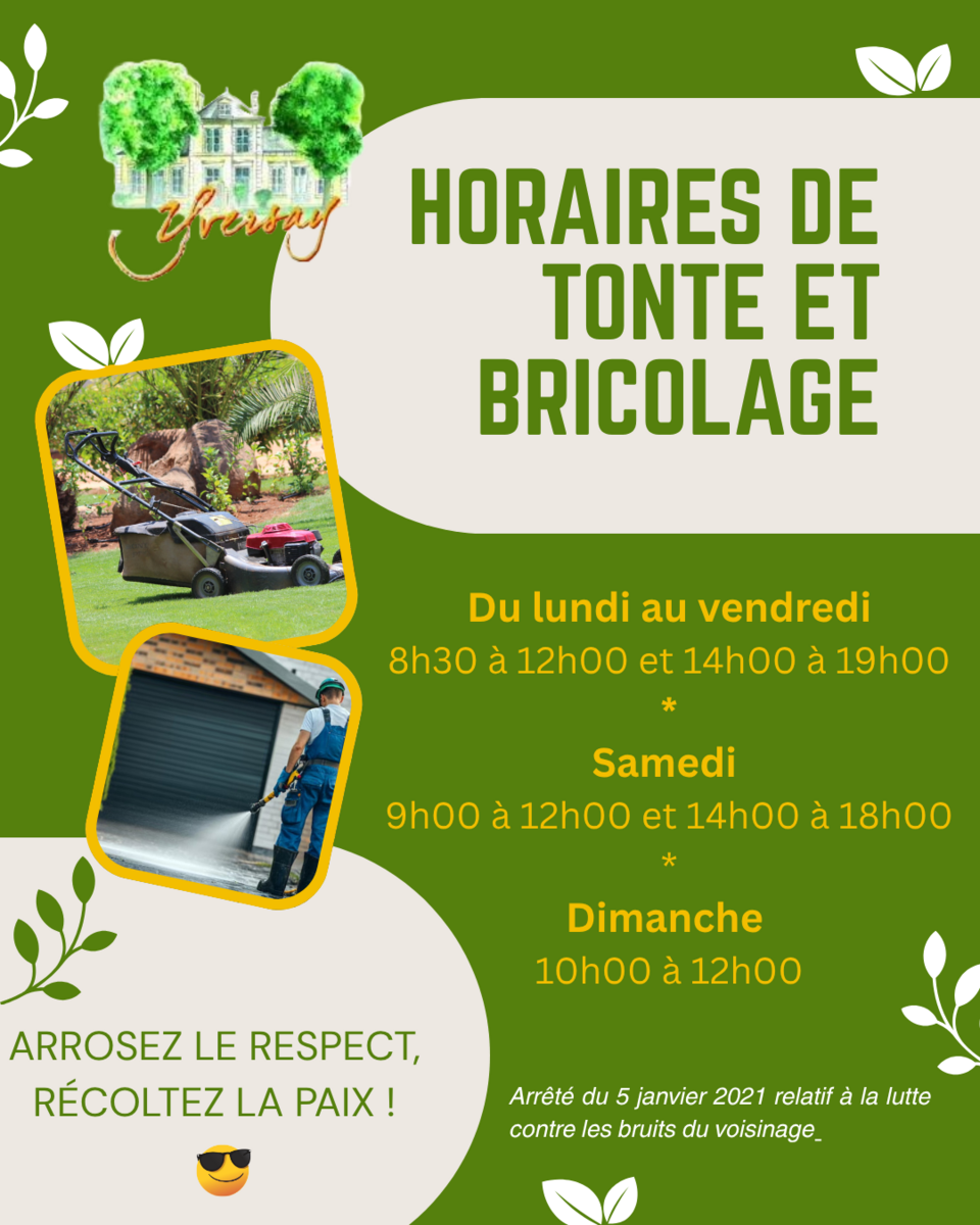 Afin de préserver la tranquillité de chacun, nous vous remercions de bien vouloir respecter les horaires autorisés pour la tonte et les travaux ⏰