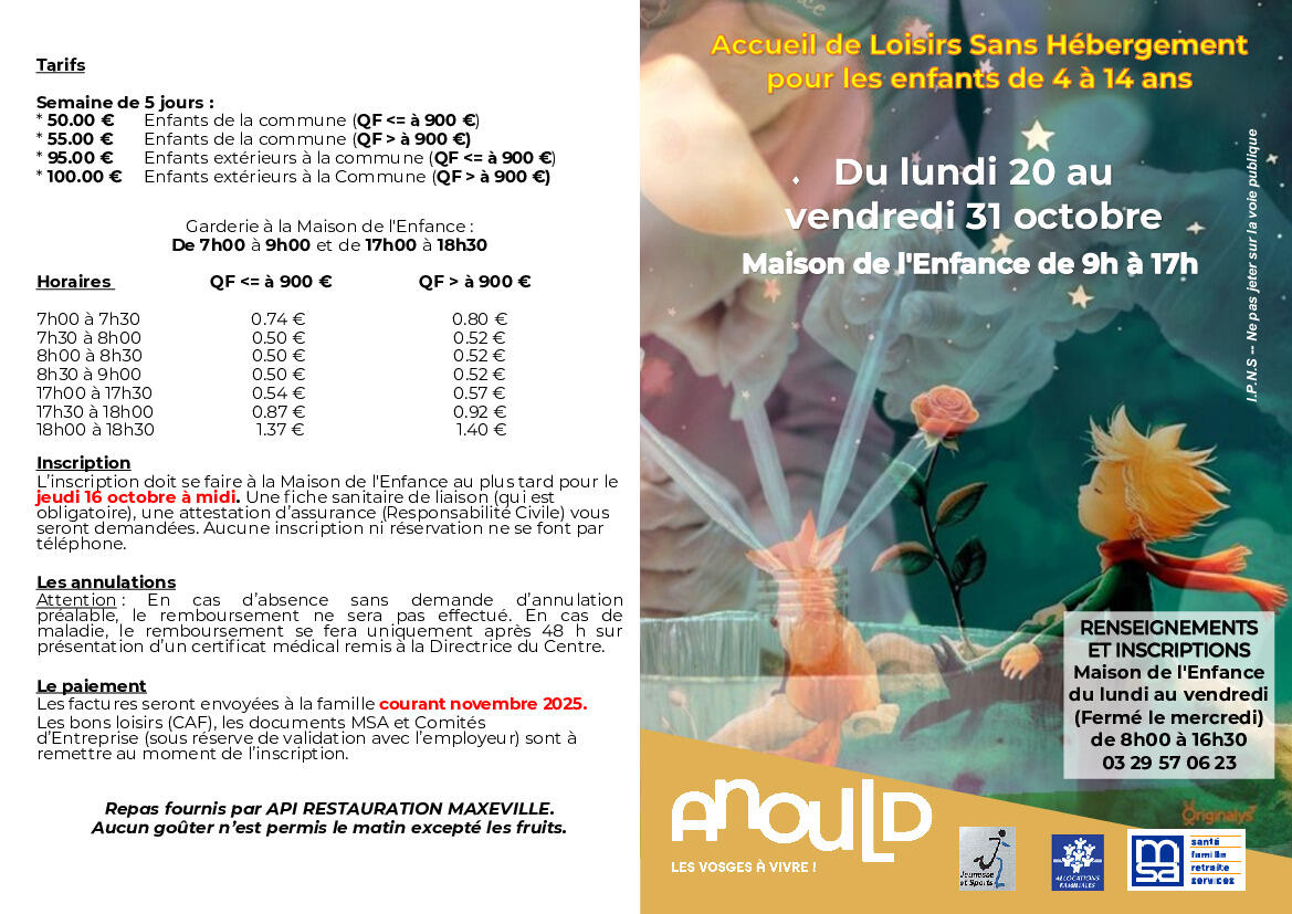ALSH TOUSSAINT 2025 10/10/2025 Du lundi 20 au vendredi 31 octobre Maison de l'Enfance Source : Mairie d'Anould