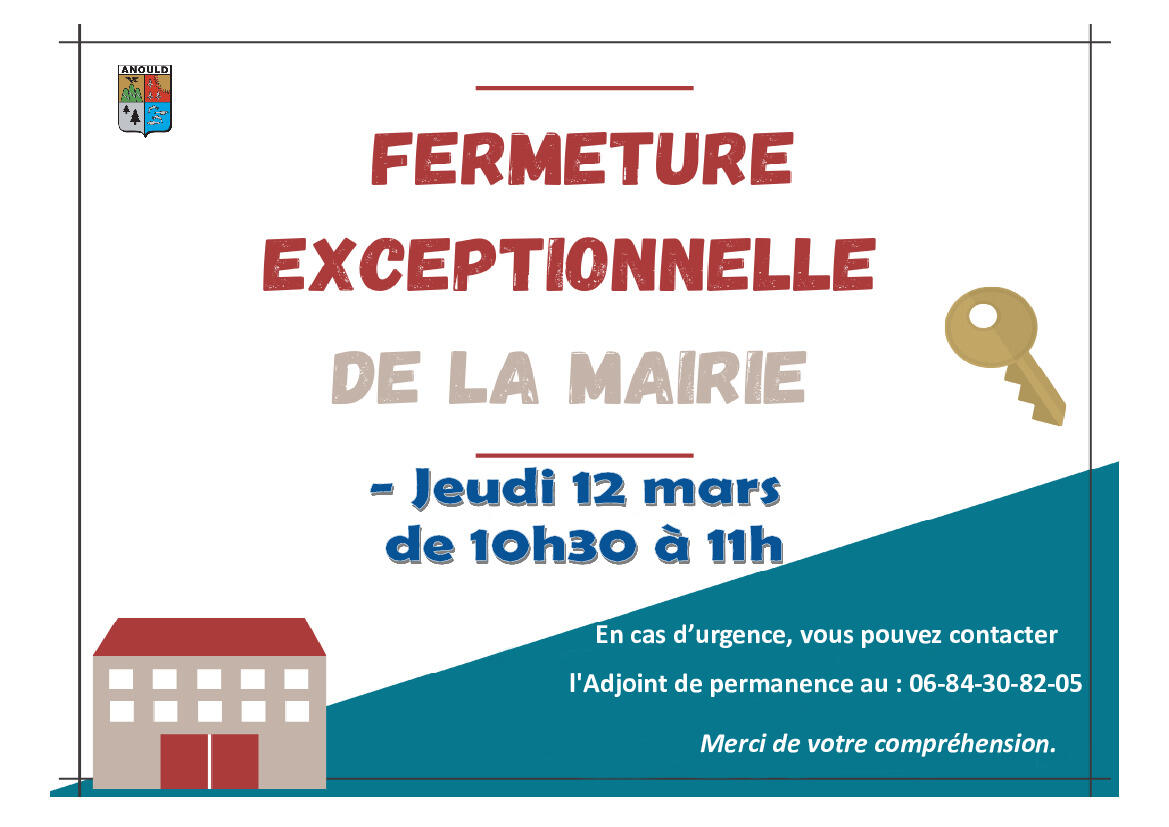 Jeu 12/03 de 10h30 à 11h : Fermeture exceptionnelle Mairie 12/03/2026 Fermeture exceptionnelle de la Mairie de 10h30 à 11h