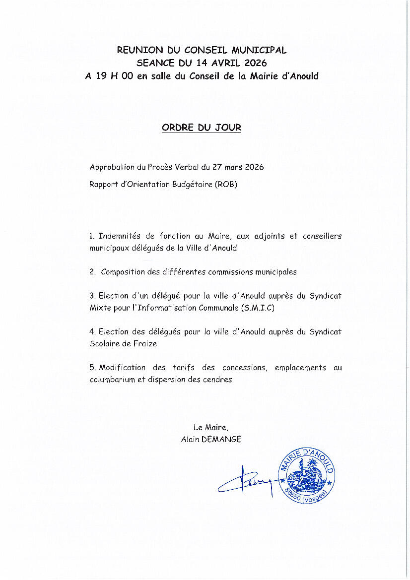 Réunion du Conseil Municipal le mardi 14 avril 2026 à 19h00 en salle du Conseil de la Mairie d'ANOULD