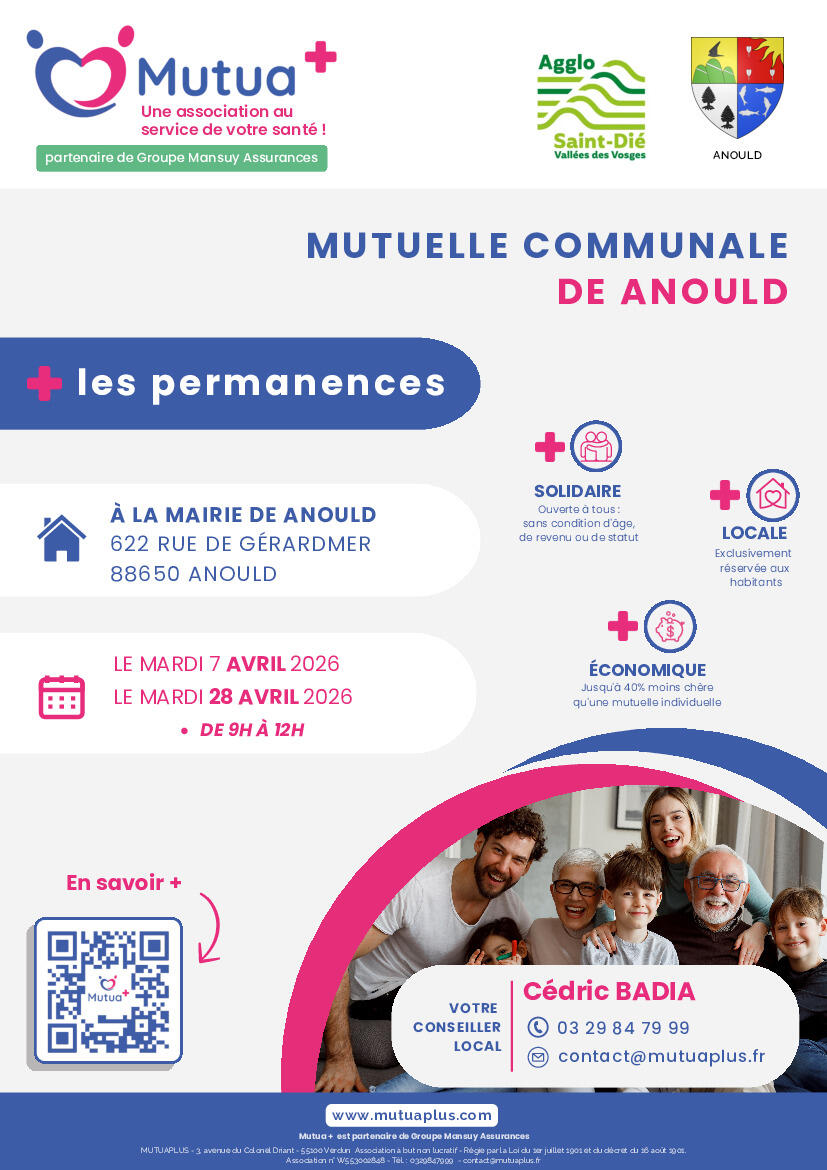 Mardis 7 et 28 avril de 9h à 12h : Permanences Mutua+ 06/04/2026 Permanences Mutua+ à la Mairie Source : Mairie d'Anould