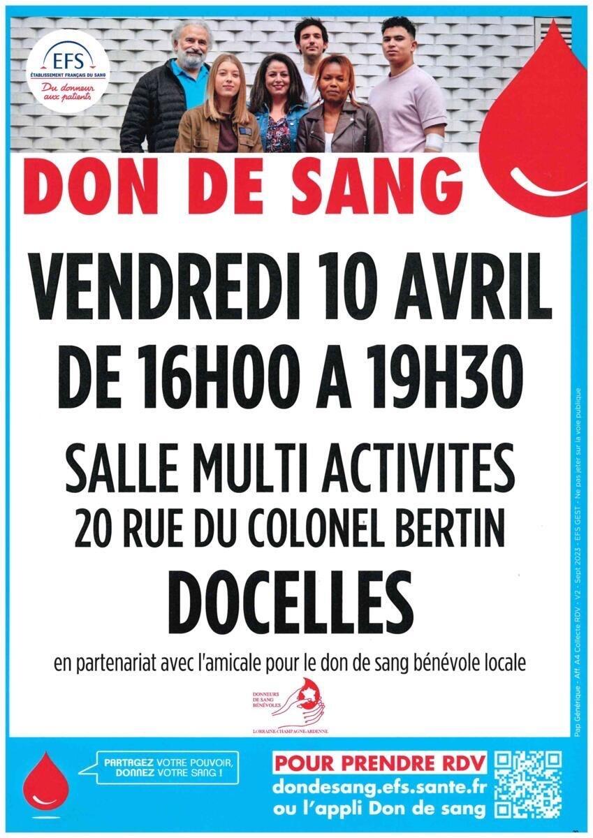 DON DU SANG - vendredi 10 avril 16h-19h30 Docelles