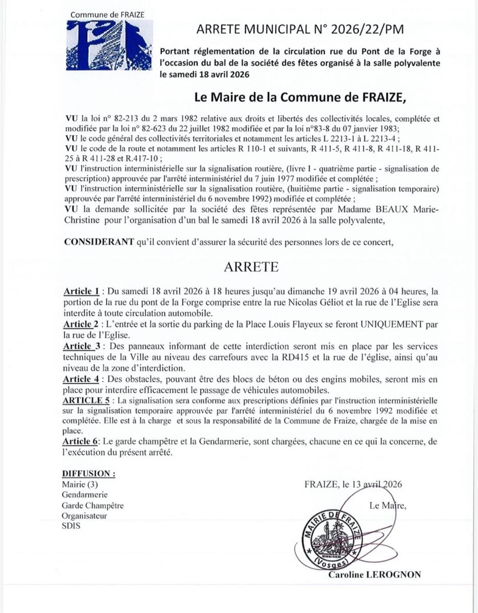 Vous trouverez ci-joint l’arrêté municipal n• 2026/22/PM portant réglementation de la circulation rue du Pont de la Forge à l'occasion du bal de la société des fêtes organisé à la salle polyvalente le samedi 18 avril 2026.