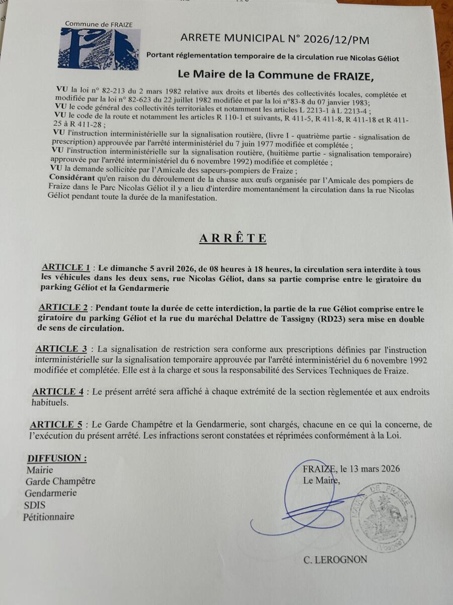 Arrêté municipal portant réglementation temporaire de la circulation rue Nicolas Géliot le dimanche 5 avril 2026 de 8:00 à 18:00 en raison du déroulement de la chasse aux œufs organisée par l’Amicale des sapeurs pompiers de Fraize.