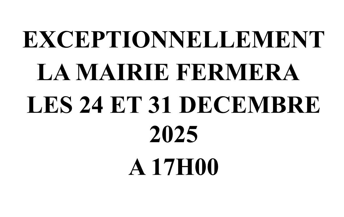 Fermeture de l'ensemble des services municipaux à 17h00 le mercredi 24 et 31 décembre 2025.