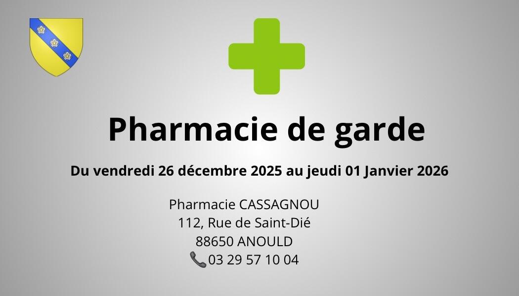 Pharmacie de garde 26/12/2025 Pharmacie de garde du vendredi 26 décembre 2025 au jeudi 01 janvier 2026 ⬇️