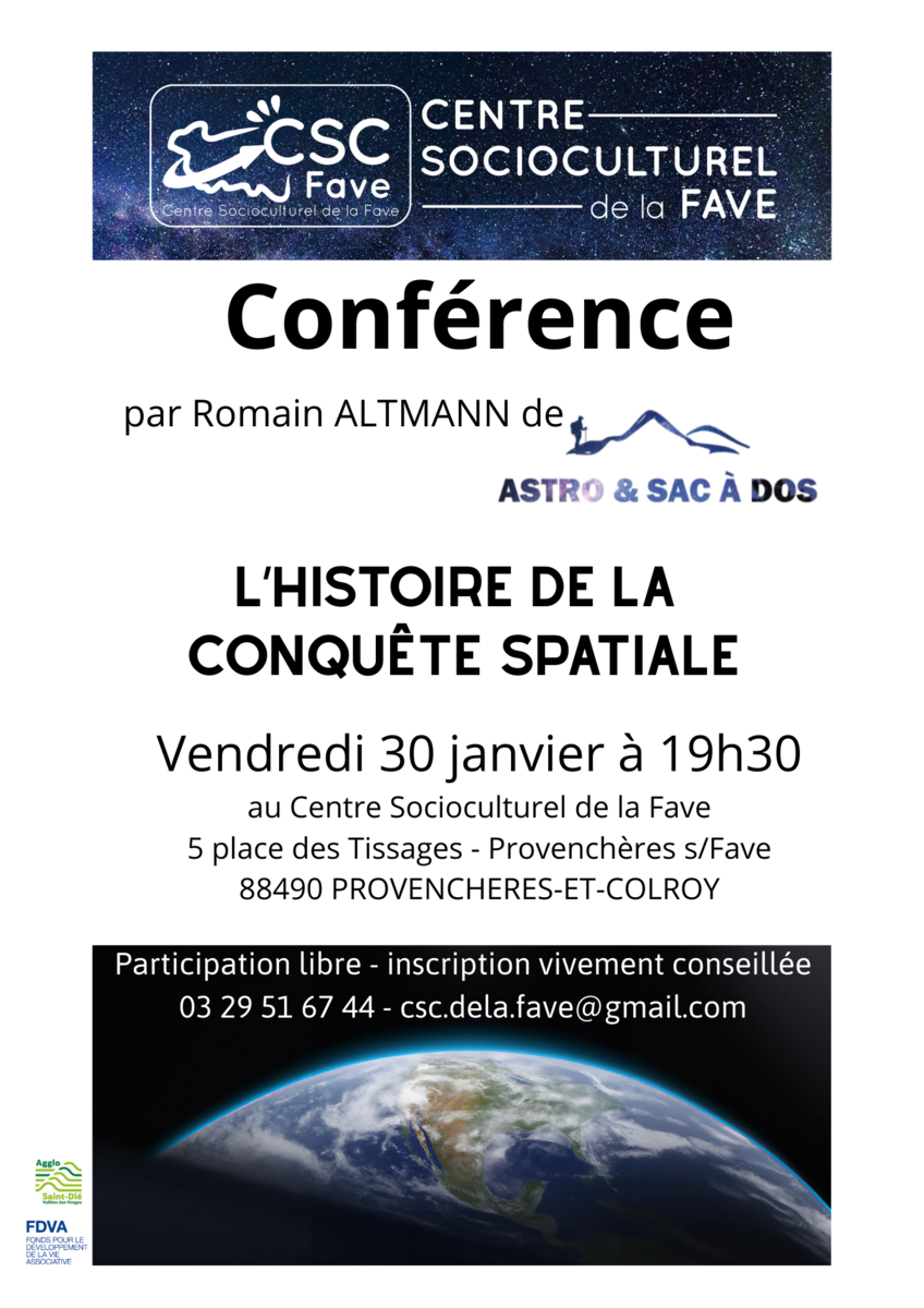 Le Centre Socioculturel de la Fave propose une conférence animée par Romain ALTMANN : L'histoire de la conquête spatiale, le Vendredi 30 janvier à 19h30 (Il est vivement conseillé de s'inscrire).