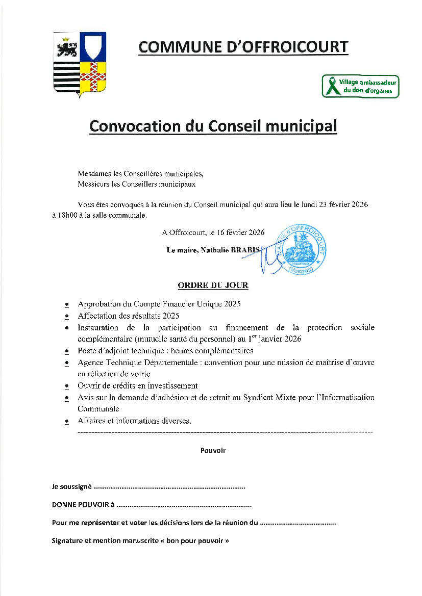 Le Conseil municipal est convoqué le lundi 23 février 2026 à 18h00, salle communale.