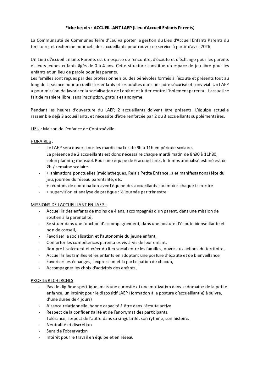 "La Communauté de Communes Terre d’Eau (CCTE) va reprendre en gestion le Lieu d’Accueil Enfant Parent (LAEP) situé actuellement à Vittel et porté par le Conseil Départemental. Afin de pouvoir ouvrir ce service dans de bonnes conditions, nous recherchons des personnes supplémentaires pour renforcer l’équipe des accueillant(e)s du LAEP.