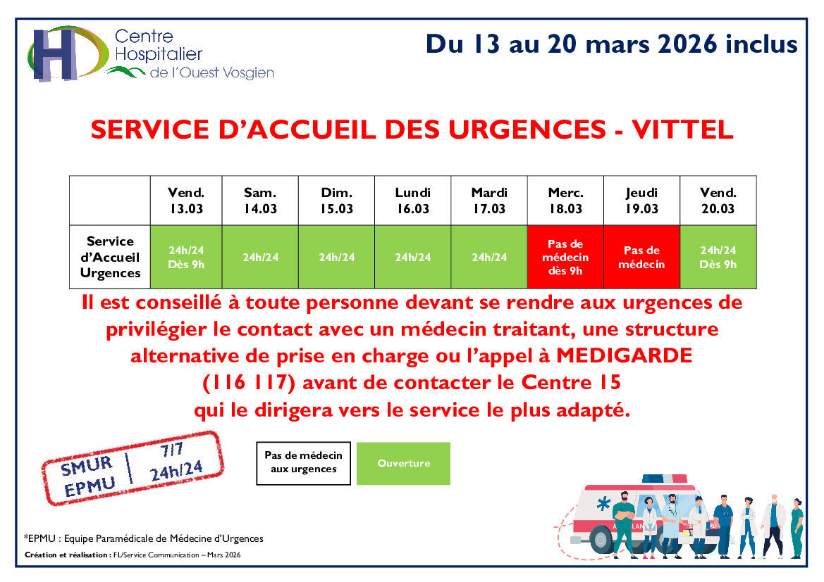 Vous trouverez en pièce jointe le planning d'ouverture des urgences de Vittel jusqu'au 20 mars 2026.