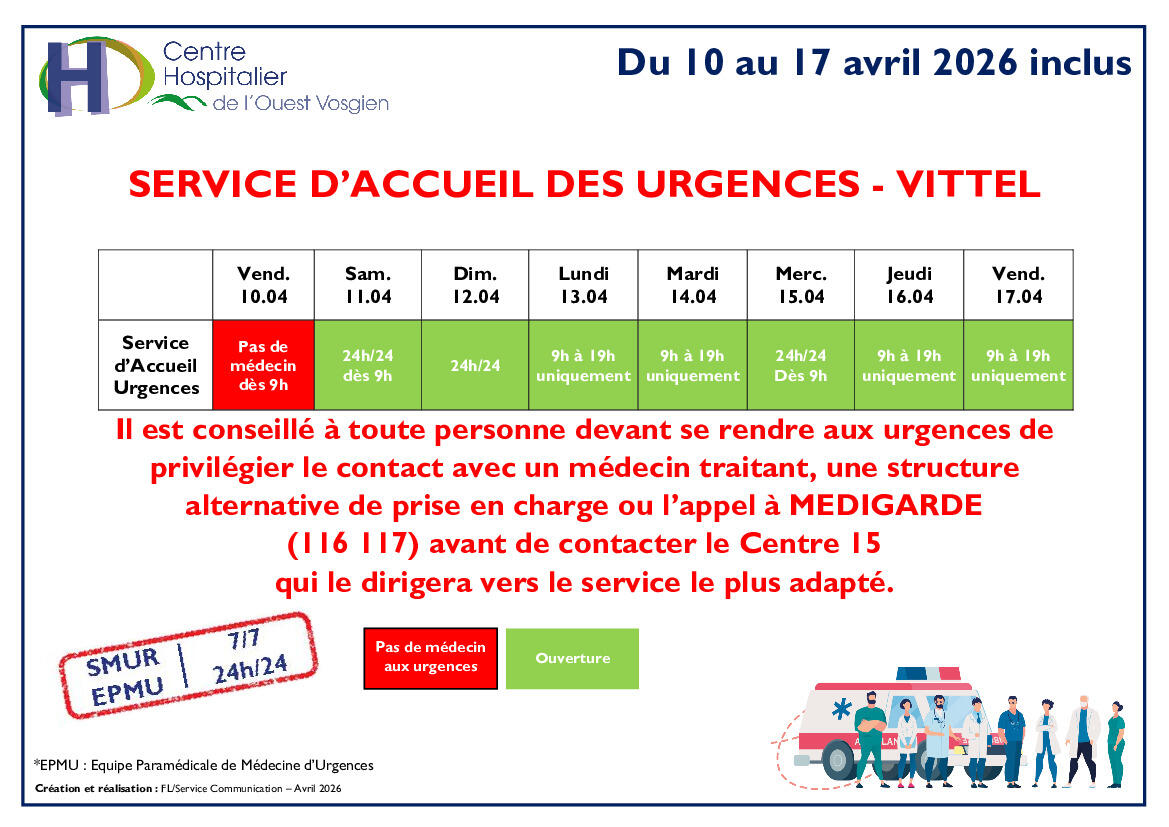 Vous trouverez en pièce jointe le planning d'ouverture des urgences de Vittel jusqu'au 17 avril 2026.