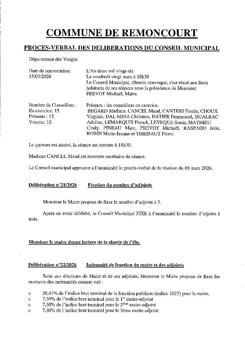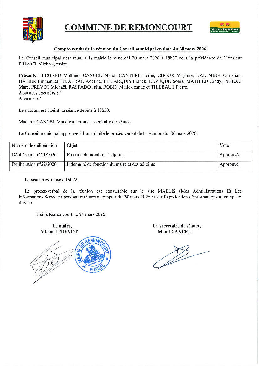 Vous trouverez en pièces jointes le compte rendu et le procès-verbal de la réunion du Conseil municipal en date du 20 mars 2026.