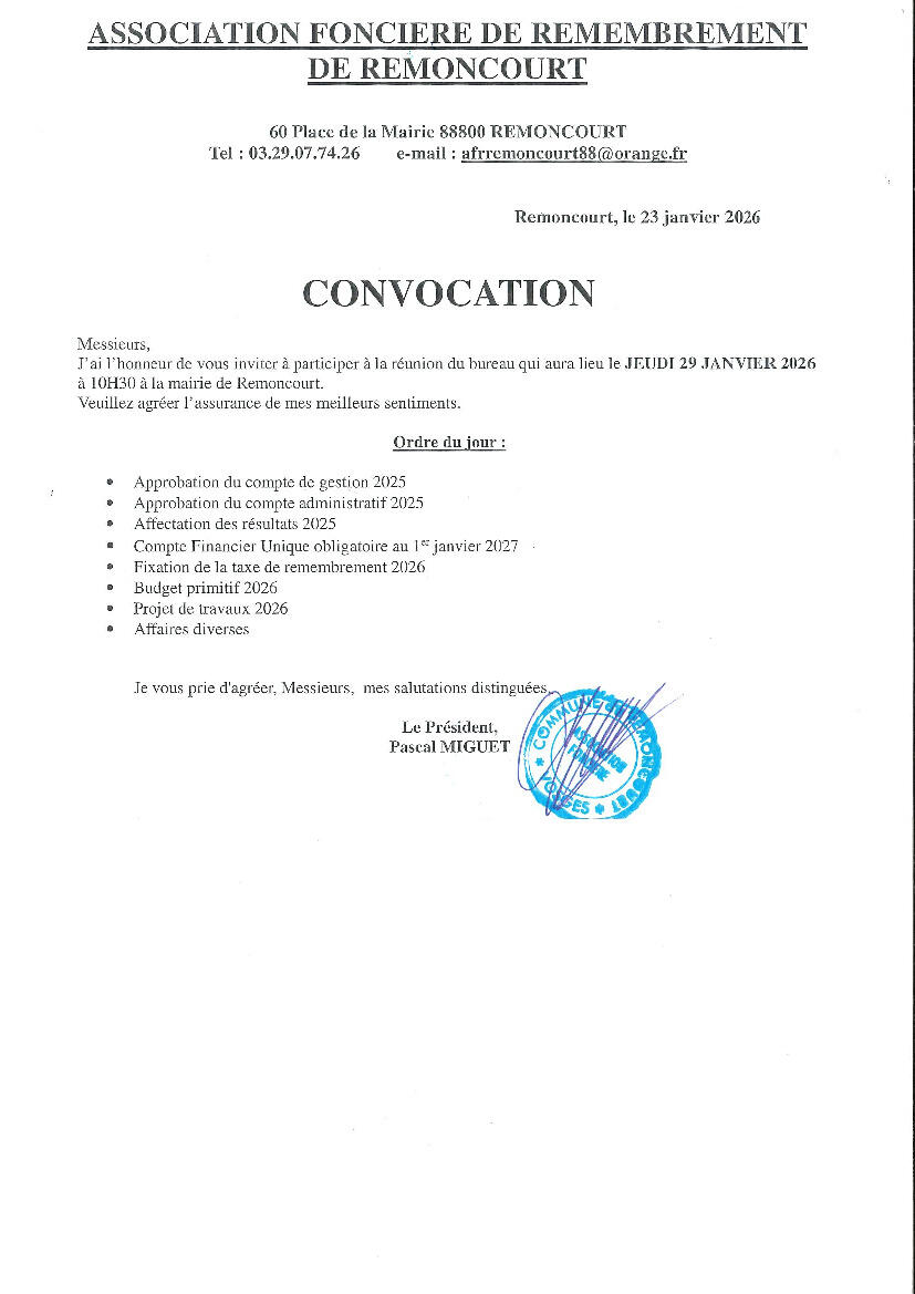 Les membres de l'AFR (Association Foncière de Remembrement) sont convoqués le jeudi 29 janvier 2026 à 10h30 en mairie de Remoncourt.