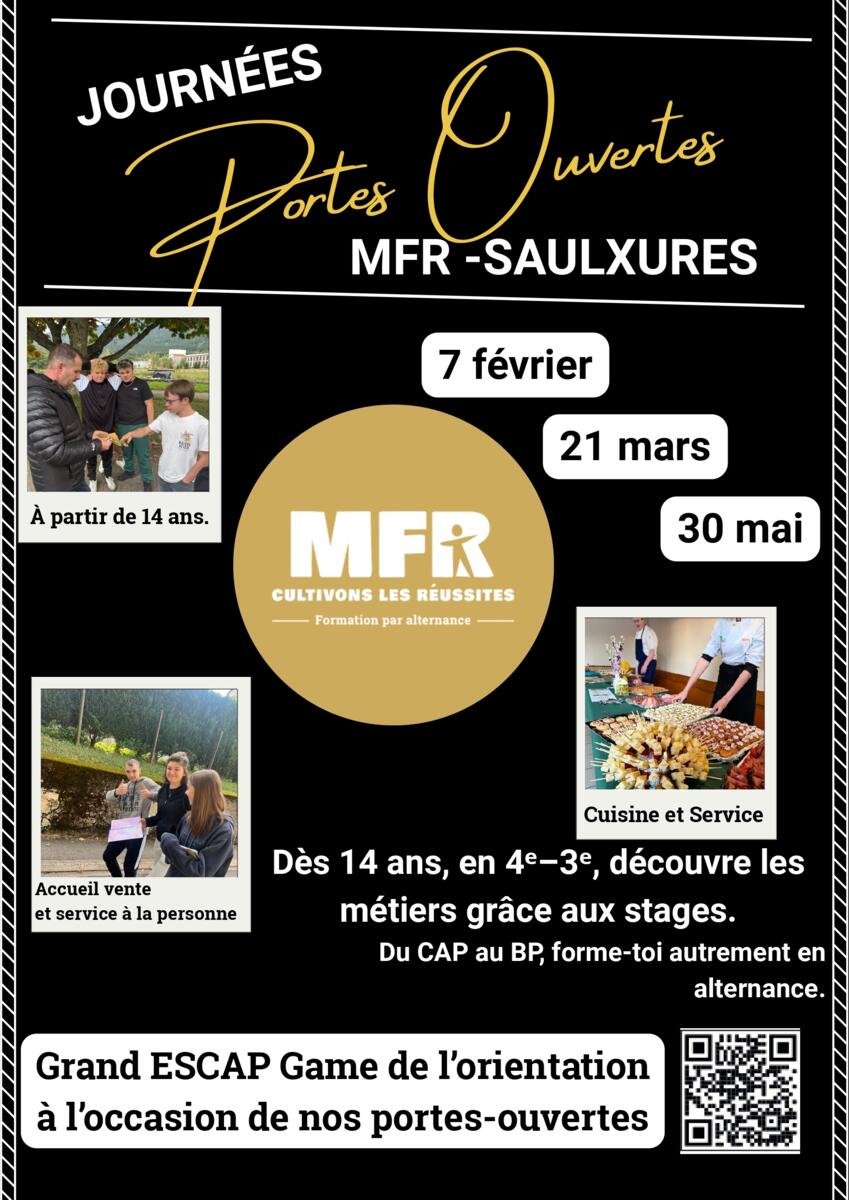 Journées Portes Ouvertes À La Mfr De Saulxures 26/01/2026 La Maison Familiale Rurale organise ses journées portes ouvertes : le 7 février, le 21 mars et le 30 mai 2026 Toutes les infos sur l'affiche ci-jointe, et sur le lien : https://mfrsaulxures.fr/