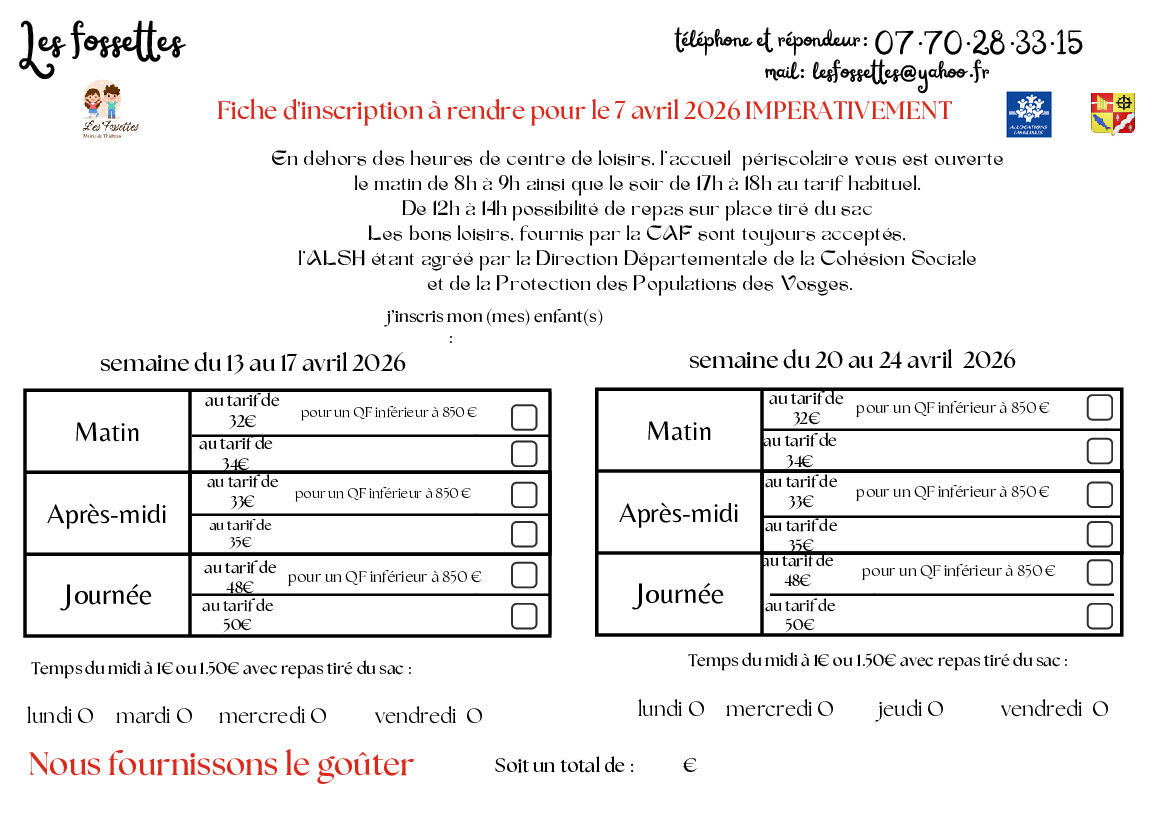 Les Fossettes: programme des vacances du 13/04 au 24/04