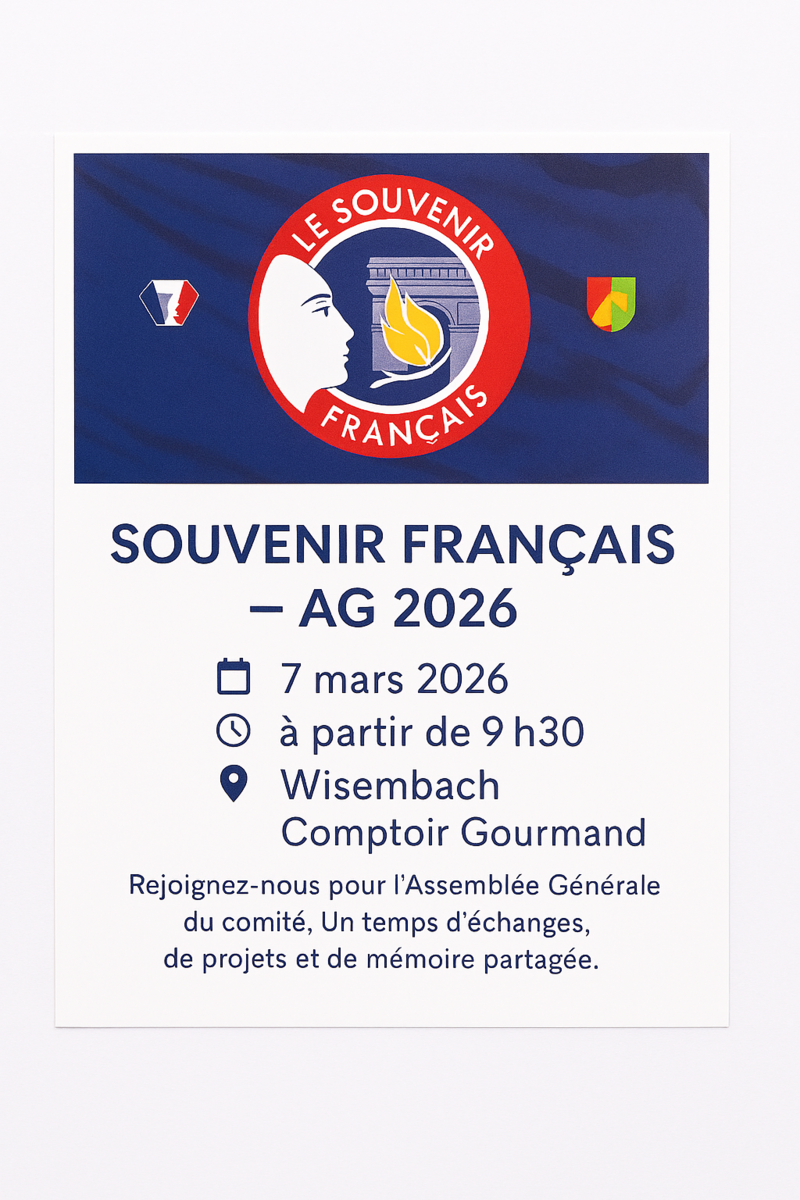 Assemblée Générale Du Souvenir Français Samedi 7 À 9H30 07/03/2026 Le comité du souvenir français vous invite à les rejoindre ce matin à partir de 9h 30 à la salle du comptoir gourmand à Wisembach pour un temps d'échanges.