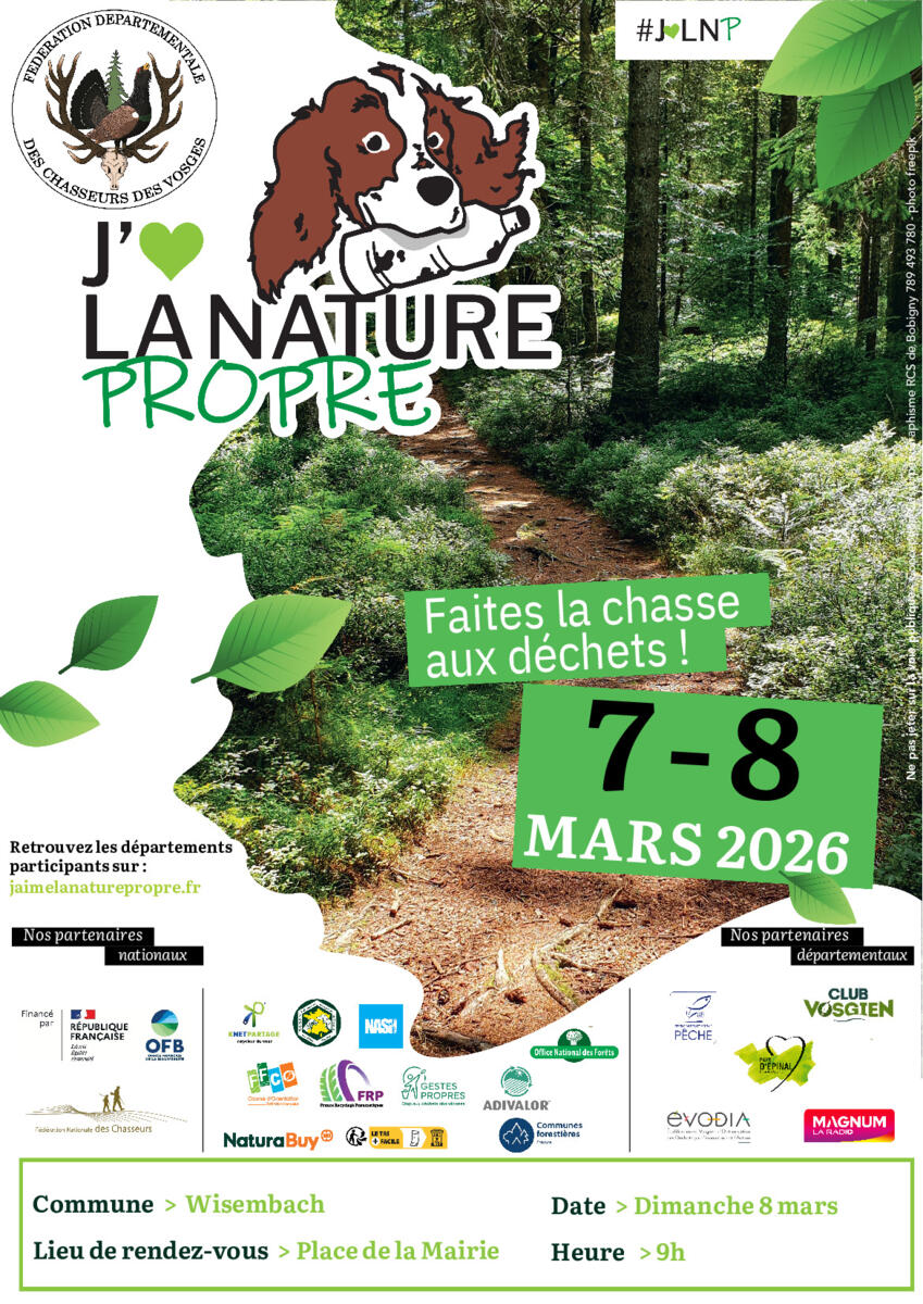 Nettoyage De Printemps Le Dimanche 8 Mars 06/03/2026 La société de chasse de Wisembach et la commune organisent le nettoyage de printemps le dimanche 8 mars. RDV à tous les volontaires à 9 h devant la mairie de Wisembach