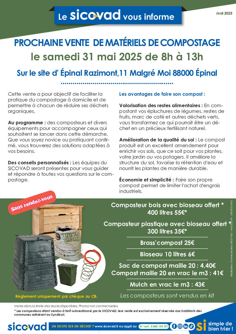 VENTE DE MATERIEL - SICOVAD 14/05/2025 le SICOVAD vous informe de la prochaine vente de matériels de compostage :