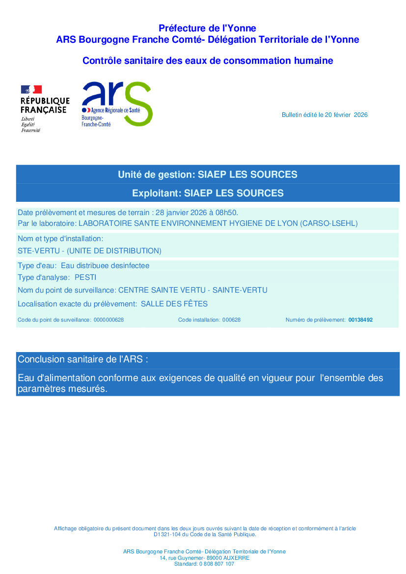 L'ARS (Agence régionale de santé) a fait procéder à des analyses de l'eau consommée à Sainte Vertu (mélange de l'eau du Puits des saumons avec l'eau de Tonnerre) en se concentrant sur la recherche de Pesticides et d'herbicides.