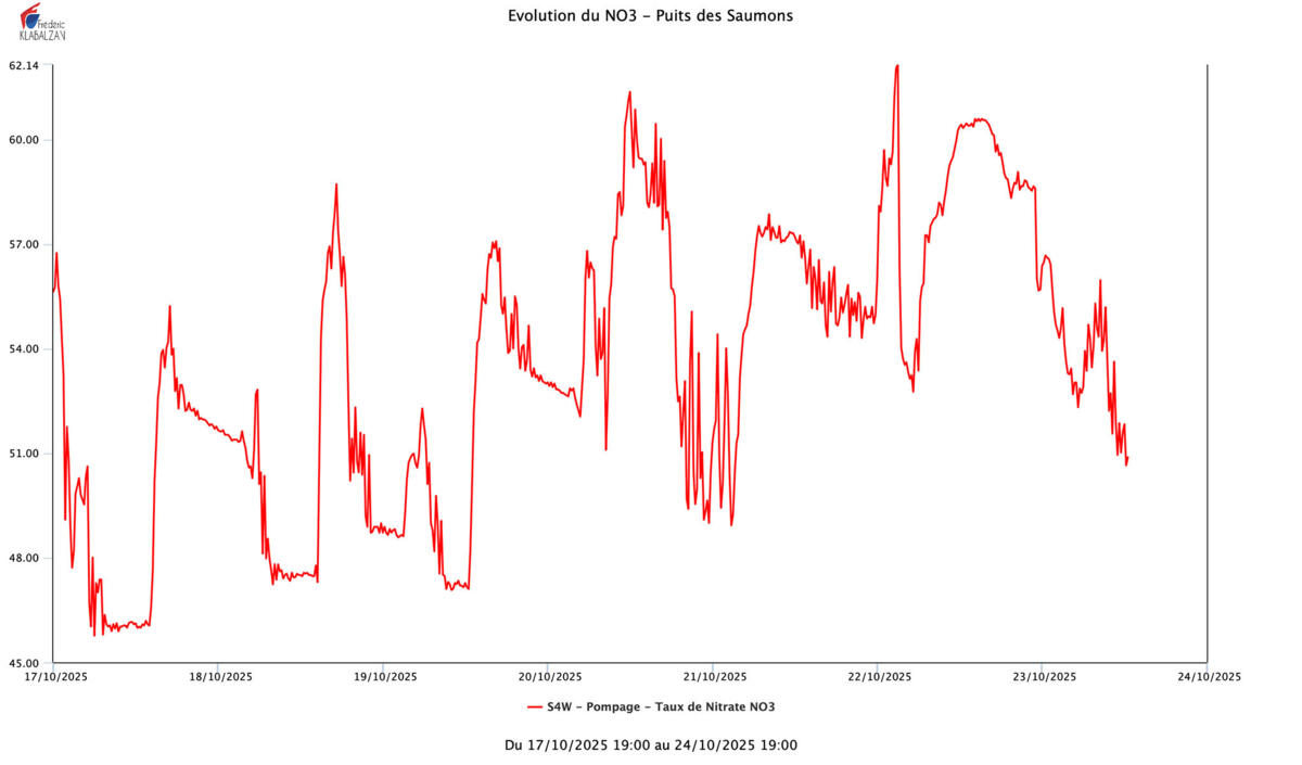 Nitrates Semaine 43 19/11/2025 Le taux moyen de nitrates dans l'eau potable mesuré Samedi 25 à la station de pompage était de 51 mg/L