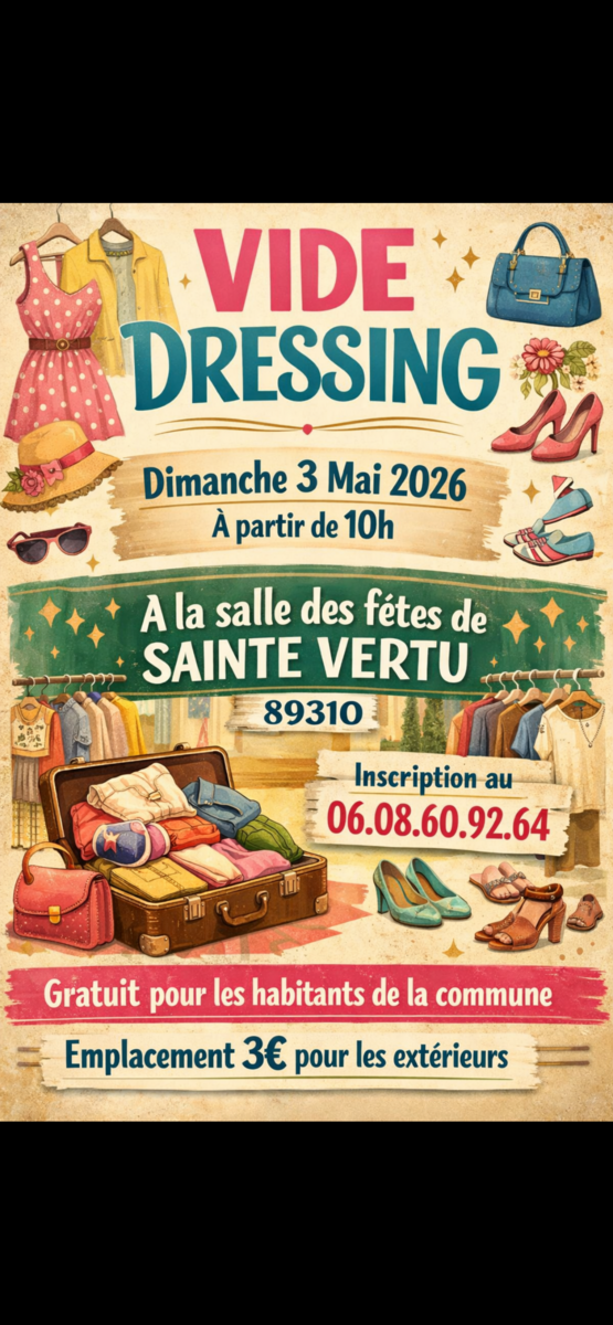 Vide Dressing 02/04/2026 Le comité des fêtes organise un vide dressing le dimanche 3 mai. À vos armoires! Nous vous attendons nombreux Inscription auprès de Roger, Natacha ou au 0608609264.