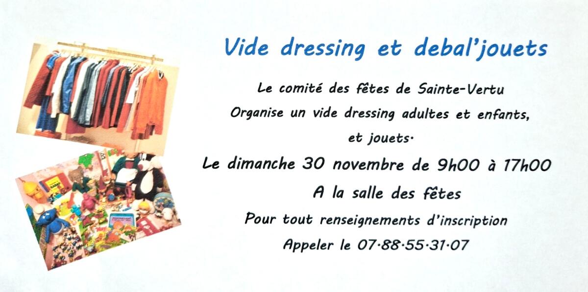 Vide Dressing Et Armoires 11/11/2025 Le comité des fêtes de Sainte-Vertu Organise un vide dressing adultes et enfants, et jouets Le dimanche 30 novembre de 9h00 à 17h00 A la salle des fête. Pour tout renseignements d'inscription Appeler le 07.88•55•31•07