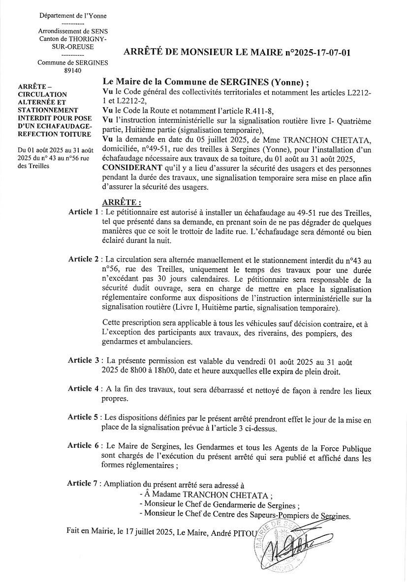Arrêté du Maire pour le Dimanche 06 juillet 2025