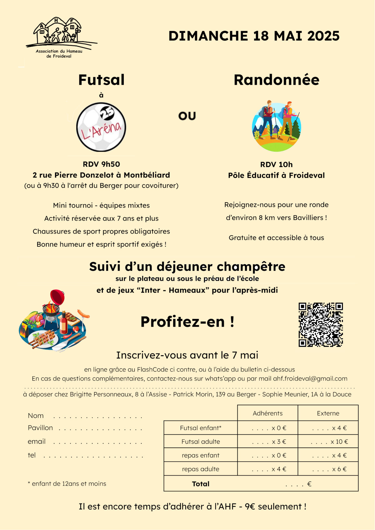 L'association du Hameau de Froideval (AHF) organise pour vous une FUTSAL ou une RANDONNÉE PÉDESTRE Dimanche 18 mai prochain, suivi d'un repas champêtre.