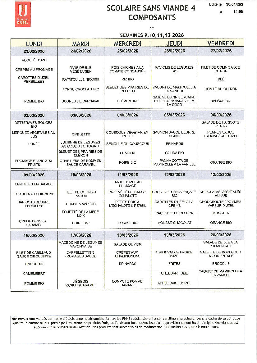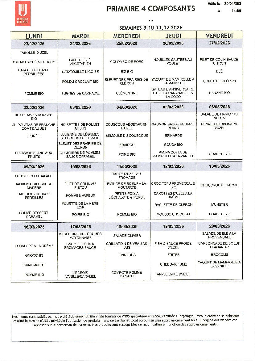 Menus de la restauration scolaire du 23/02 au 20/03/2026