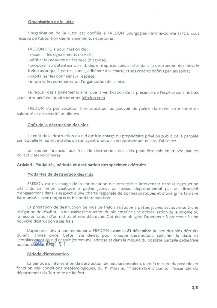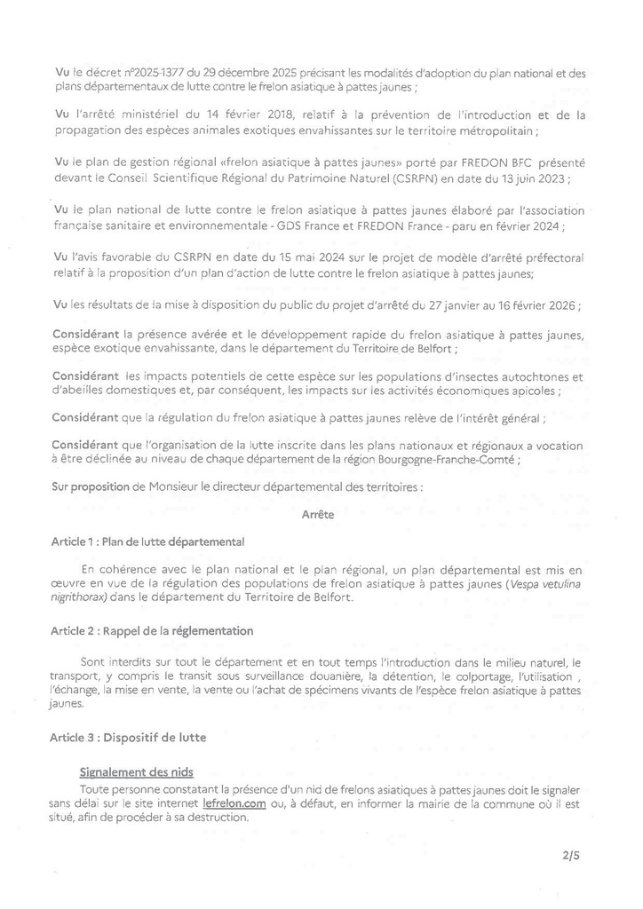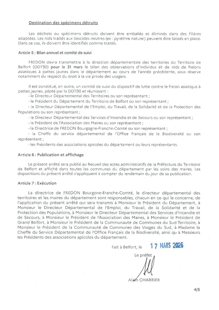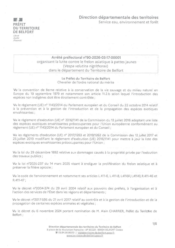 Veuillez trouver ci-dessous l'arrêté préfectoral n° 90-2026-03-17-00001 du 17 mars 2026 organisant la lutte contre le frelon asiatique dans le Territoire de Belfort