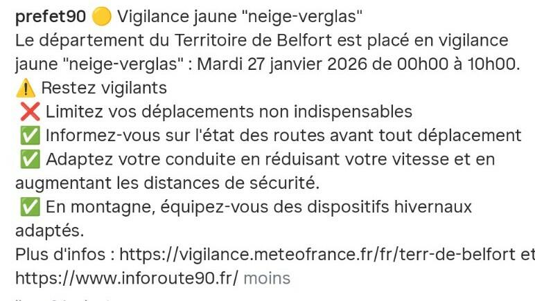 VIGILANCE NEIGE / VERGLAS 26/01/2026 Ci-joint une information de la part de la Préfecture du Territoire de Belfort :