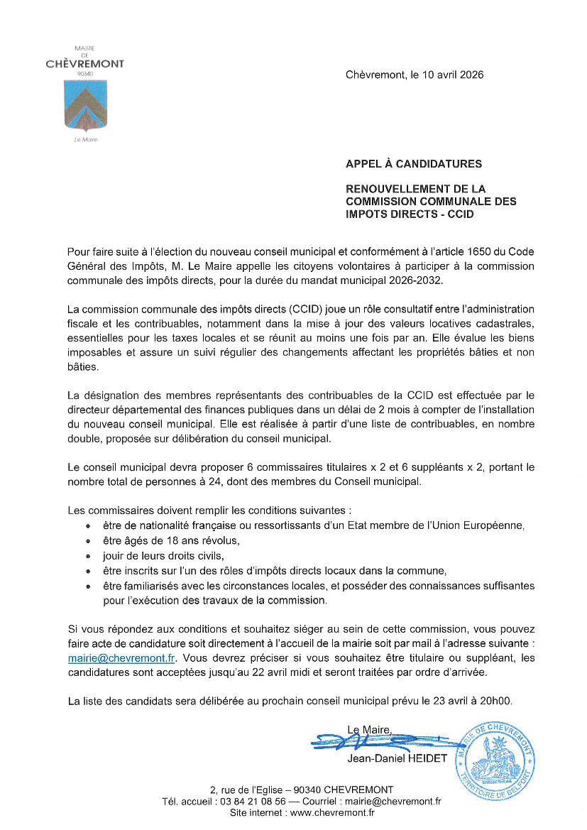 Appel à candidature : Commission des impôts directs (CCID) 11/04/2026 Renouvellement de la commission des impôts directs.