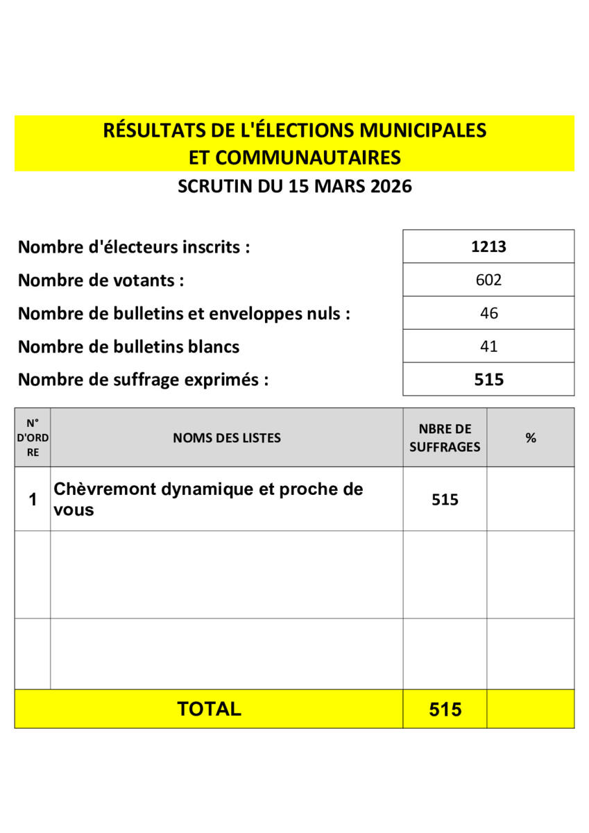 Résultats des élections municipales 17/03/2026 Veuillez trouver les résultats des élections municipales de la Commune.