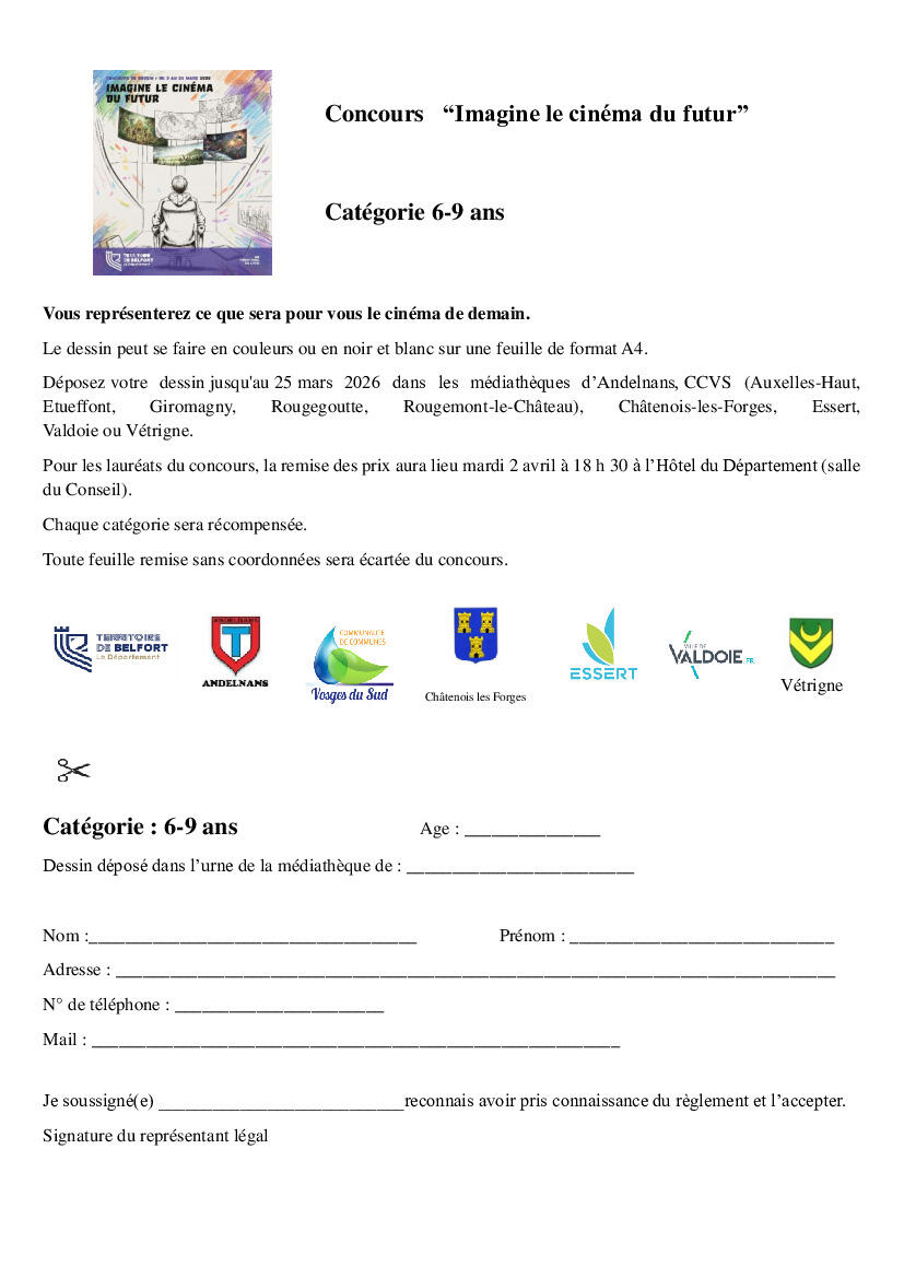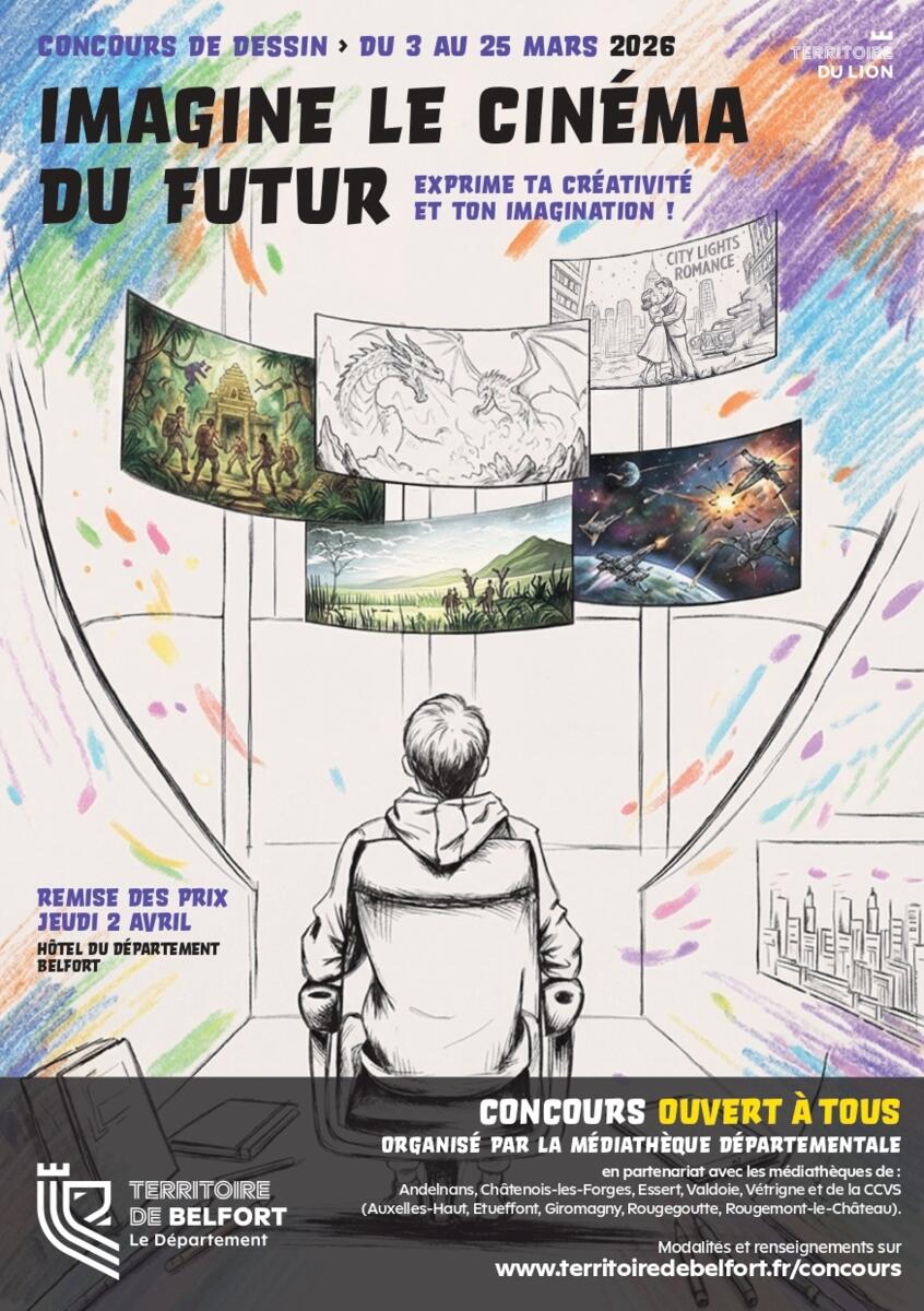 un concours de dessin sur le thème du cinéma organisé par la Médiathèque Départementale du Territoire de Belfort. Les bulletins de participation sont disponibles à la médiathèque et en pièce jointe si vous souhaitez les imprimer.