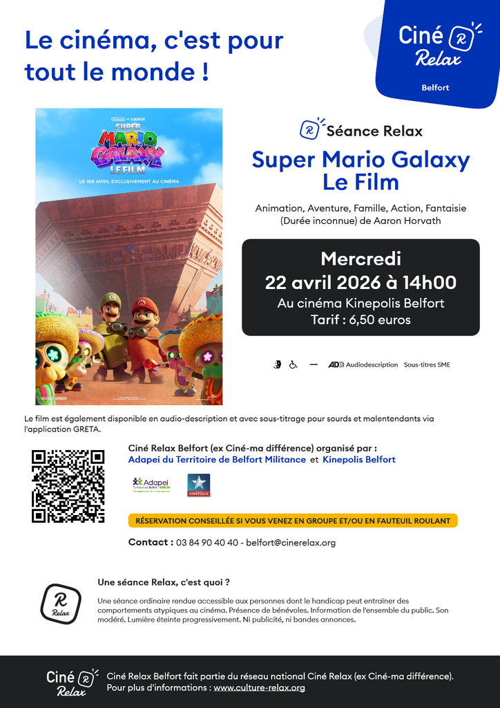 Le dispositif CinĂ© Relax Belfort est organisĂ© par l'association Adapei du Territoire de Belfort Militance et le Kinepolis Belfort.Â