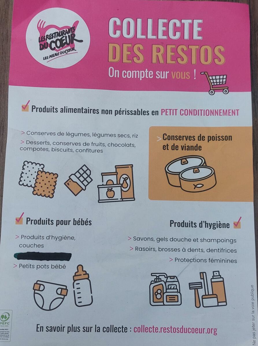 La collecte des restos du cœur est prévue Dimanche 15 Mars de 8h à 18h dans la salle de classe du conservatoire (site de Frais).