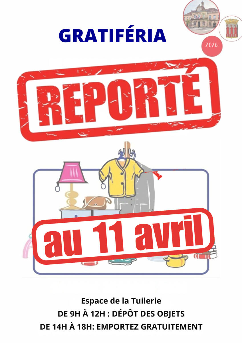 La gratiferia initialement prévue le samedi 28 mars 2026 est reportée.