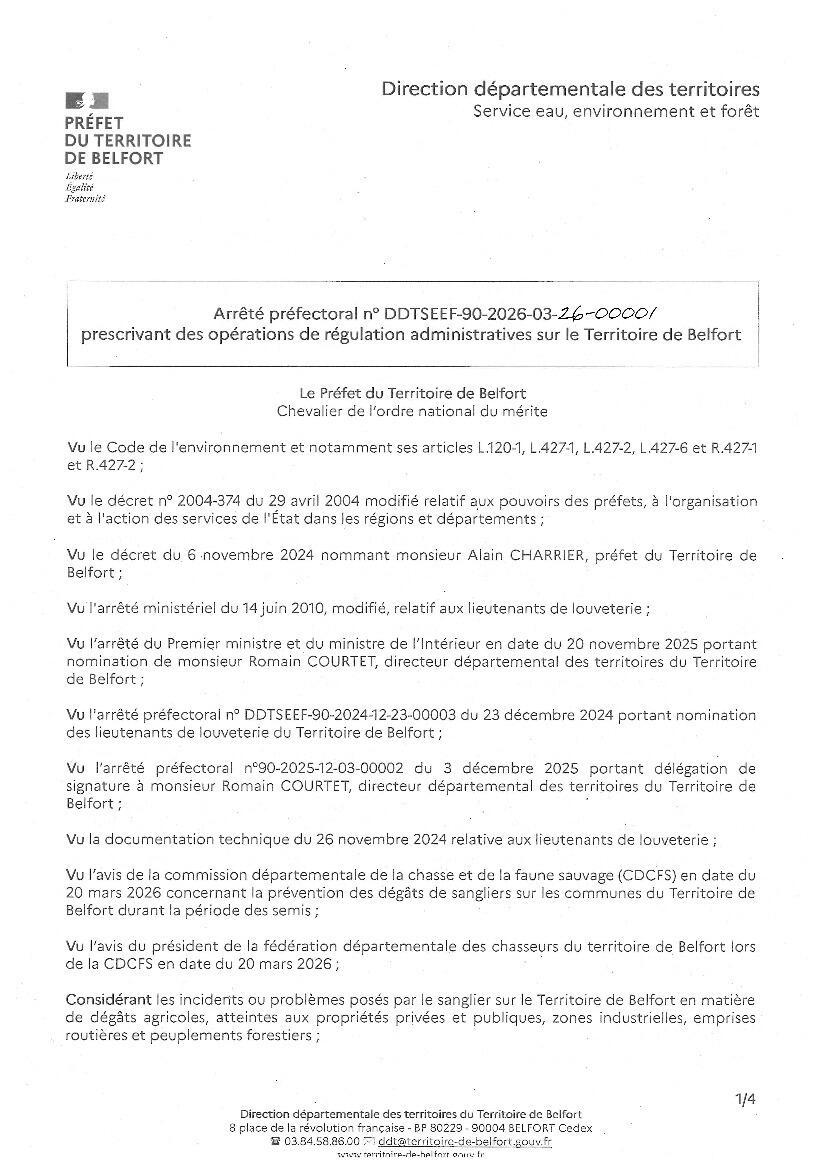 Je vous prie de bien vouloir trouver ci-joint l'arrêté préfectoral nº DDTSEEF-90-2026-03-26-00001 prescrivant des opérations de régulation administratives du sanglier sur le Territoire de Belfort.
