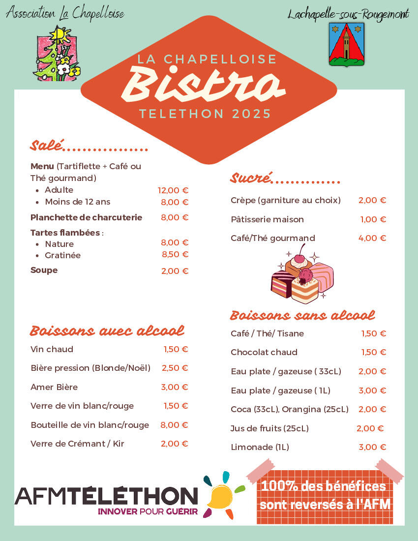 Vous trouverez toutes les informations sur cette journée dans le flyer, sans oublier le "Bistro" Téléthon 2025 !