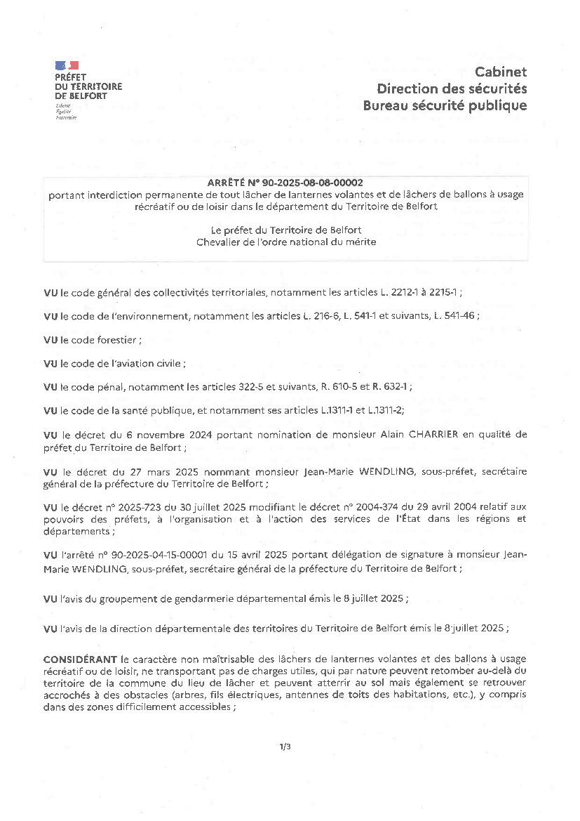 Vous trouverez ci-dessous l'arrêté préfectoral du 8 août 2025 qui interdit, de manière permanente, tout lâcher de lanternes volantes et de lâchers de ballons à usage récréatif ou de loisir dans l'ensemble du département du Territoire de Belfort.