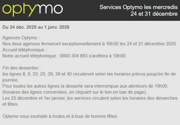 OPTYMO : fonctionnement du 24/12 au 01/01