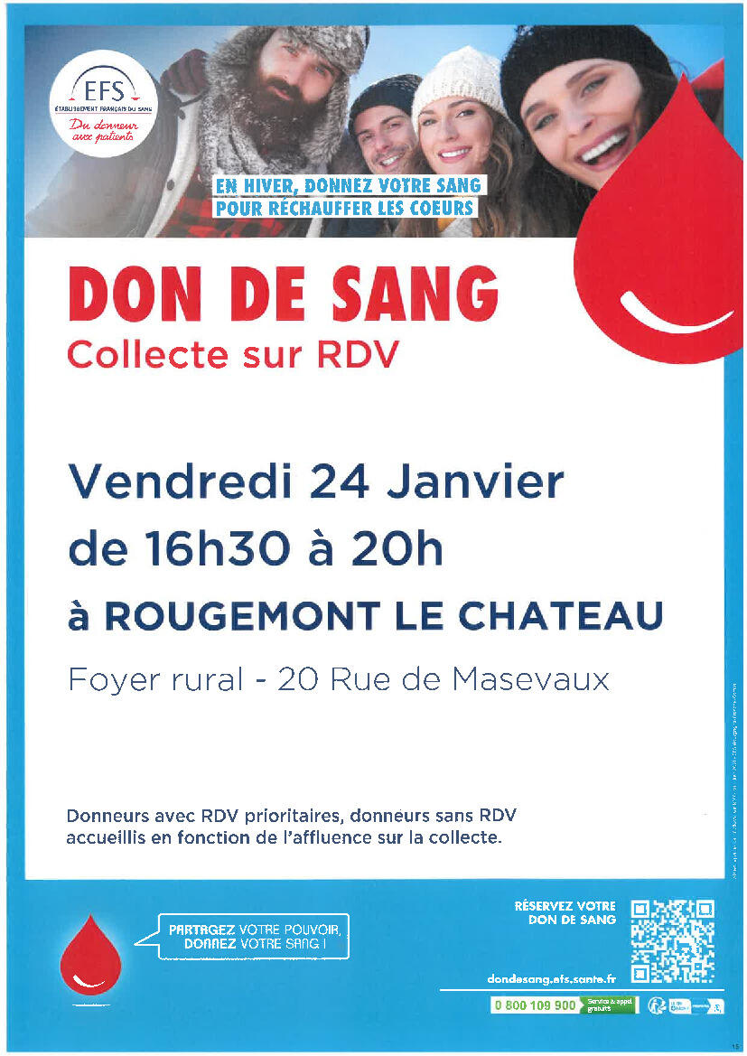 Don du sang 15/01/2025 📅Vendredi 24 janvier 2025 ⏲de 16h30 à 20h 🏥Foyer Rural de Rougemont-le-Château